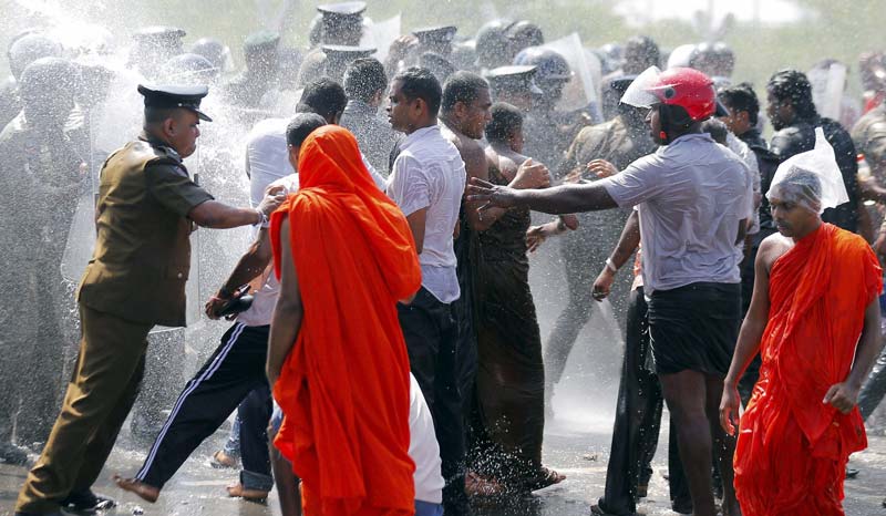শ্রীলঙ্কায় সাধারণ মানুষের ভাবাবেগ কিন্তু চিন বিরোধী। চিনা বিনিয়োগে তৈরি বিভিন্ন প্রকল্পের জন্য শ্রীলঙ্কার বিভিন্ন এলাকায় জমি অধিগ্রহণ হয়েছে। তার বিরুদ্ধে সাধারণ মানুষ এবং বৌদ্ধ সন্ন্যাসীরা তীব্র আন্দোলন করছেন। পুলিশকে জলকামান ব্যবহার করে বা বলপ্রয়োগ করে ভাঙতে হচ্ছে আন্দোলন। ছবি: এপি।