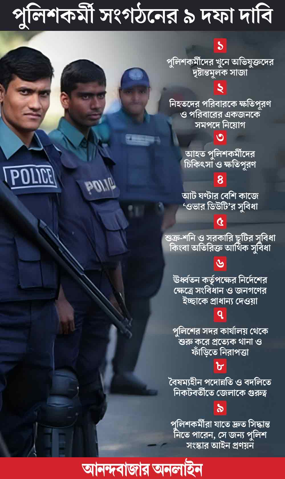 ‘ঢাকা ট্রিবিউন’-এ প্রকাশিত তথ্য অনুযায়ী, নিজেদের নিরাপত্তার দাবিতে কর্মবিরতি ঘোষণা করেছে সে দেশের পুলিশকর্মীদের সংগঠন। মঙ্গলবার বিকেলে নিজেদের দাবিদাওয়া নিয়ে একটি প্রেস বিজ্ঞপ্তি প্রকাশ করেছে ওই সংগঠন। সূত্রের খবর, সাম্প্রতিক অশান্তিতে পুলিশকর্মীদের খুনে অভিযুক্তদের সাজা ও ক্ষতিপূরণ-সহ মোট ন’দফা দাবিতে কর্মবিরতি শুরু করেছে পুলিশকর্ম