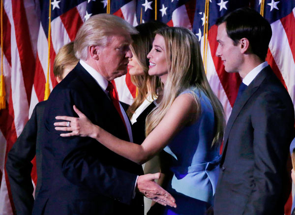 নির্বাচনে জেতার পর মেয়ে ইভাঙ্কা এবং কুশনারের সঙ্গে ট্রাম্প। ছবি: রয়টার্স।