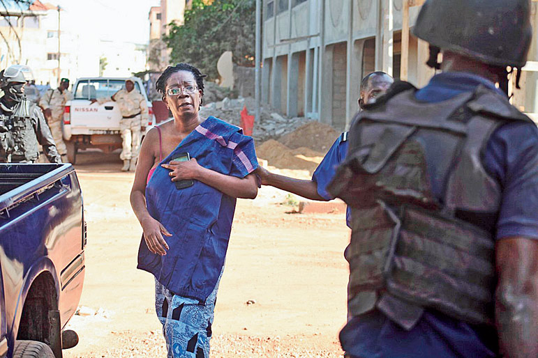 ঘটনার সঙ্গে সঙ্গেই এলাকায় হাজির হয়ে যায় পুলিশ। মুহূর্তের মধ্যেই ঘিরে ফেলা হয় হোটেল চত্বর। টিভি ফুটেজে দেখা যায়, এ কে-৪৭ হাতে হোটেলের বারান্দায় ঘোরাঘুরি করছে দুষ্কৃতীরা। এক পুলিশ কর্তা জানিয়েছেন, হোটেলে ঢুকে ধীরে ধীরে এক একটা তলা থেকে তাঁরা পণবন্দিদের মুক্ত করা শুরু করেন। এক বাসিন্দার কথায়, ‘‘পুলিশ আমাকে এবং আরও ছ’জনকে বাইরে নিয়ে আসে।’’ হোটেলে আটক ছিলেন গিনির এক গায়ক, সেকুবা ব্যাম্বিনো। তিনি বলেছেন, ‘‘রিসেপশন চত্বর থেকে আওয়াজ পাই প্রথমে। বুঝতে পারি নিছক পিস্তলের শব্দ নয়। ঠিক পাশের ঘরেই হানা দিয়েছিল জঙ্গিরা। আমি খাটের তলায় লুকিয়ে ছিলাম।’’