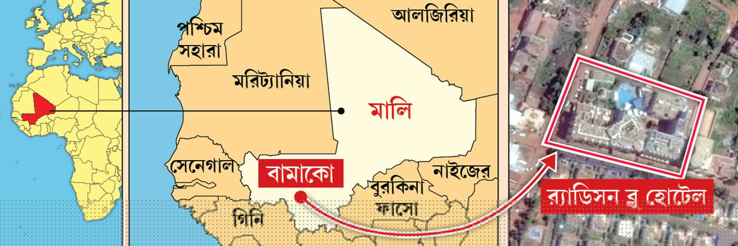 প্যারিস হামলার এক সপ্তাহ পেরোতে না পেরোতেই আবার জঙ্গি হামলা। এ বার অবশ্য ইউরোপ নয়। লক্ষ্য পশ্চিম আফ্রিকার দেশ মালি। সেখানকার রাজধানী বামাকোর একটি বিলাসবহুল হোটেল ‘র্যাডিসন ব্লু’-তে আজ বন্দুক হাতে আট ঘণ্টা ধরে তাণ্ডব চালাল জঙ্গিরা। প্রথমেই হোটেলের ১৭০ জনকে আটকে রাখে জঙ্গিরা। পণবন্দিদের মধ্যে ছিলেন ২০ জন ভারতীয়ও। শেষ পর্যন্ত অবশ্য মালি সেনা-পুলিশের সঙ্গে ফরাসি এবং মার্কিন বাহিনীর যৌথ অভিযানে মুক্ত করা যায় বেশির ভাগ পণবন্দিকে। কিন্তু ঘটনাস্থলে উপস্থিত রাষ্ট্রপুঞ্জের শান্তিরক্ষীবাহিনী সূত্রে খবর, তাঁরা হোটেলে ২৯টি দেহ পড়ে থাকতে দেখেছেন। তার মধ্যে দু’টি দেহ বন্দুকবাজের হলেও বাকি ২৭ জন পণবন্দি বলে শনাক্ত করা গিয়েছে। হামলার দায় স্বীকার করেছে আল কায়দার একটি শাখা সংগঠন।