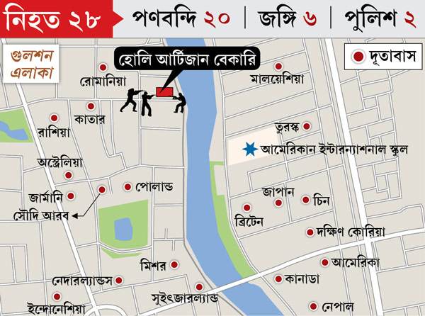 উৎকণ্ঠার ১২ ঘণ্টার অবসান। সেনা কম্যান্ডোদের অভিযানে জঙ্গিদের দখলমুক্ত হল বাংলাদেশের রাজধানী ঢাকার গুলশনে কূটনৈতিক এলাকার জনপ্রিয় স্প্যানিশ রেস্তোরাঁ হোলি আর্টিজান বেকারি। ভারতীয় সময় তখন সকাল পৌনে আটটা। ঘণ্টাখানেক আগে দেওয়াল ভেঙে ঢোকা কম্যান্ডোরা ‘কাজ সেরে’ সামনের দরজা দিয়ে বেরিয়ে আসামাত্র বাকিরা যখন উল্লাসে ফেটে পড়ছেন, তখনও কেউ জানেন না ঠিক কী ঘটেছে। কী পরিণতি ভিতরে পণবন্দি হয়ে থাকা জনা ৩৫ দেশি-বিদেশি নাগরিকের। এর ঘণ্টাখানেক পরে একটি অনুষ্ঠানে প্রধানমন্ত্রী শেখ হাসিনা জানালেন— অভিযান সফল। ছয় হামলাকারীকে নিকেশ করে ১৩ পণবন্দিকে জীবিত উদ্ধার করা গিয়েছে। এদের মধ্যে তিন জন বিদেশি। কিন্তু সকলকে উদ্ধার করা যায়নি। রেস্তোরাঁর মধ্যে ‘তারা’ যে ভাবে হত্যাকাণ্ড চালিয়েছে, তা চোখে দেখা যায় না! বিরোধী বিএনপি নেত্রী খালেদা জিয়া এই ‘মানুষ খুনের ঘটনা’র নিন্দা করলেও এর জন্য দায়ী করেছেন হাসিনা সরকারের ‘অপশাসন’কে।