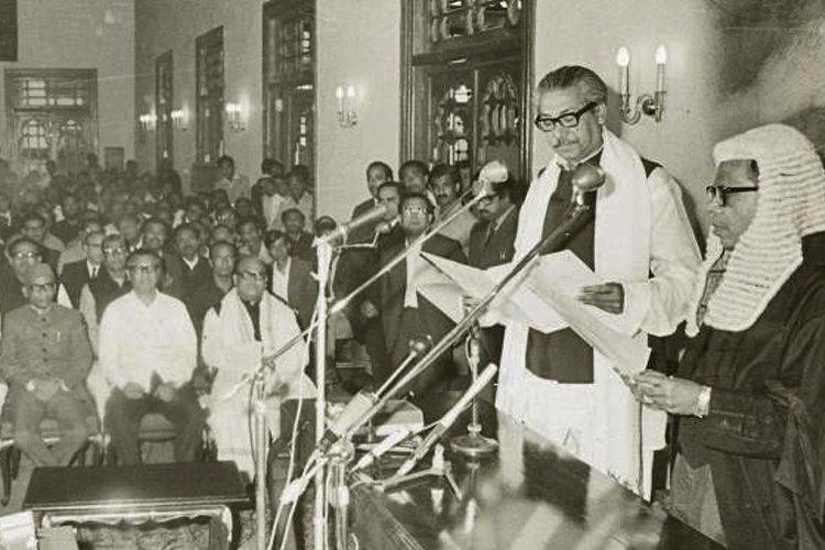 ১৯৭২ সালে বাংলাদেশের প্রধানমন্ত্রী হিসাবে শপথ নিচ্ছেন শেখ মুজিবুর রহমান।—আনন্দবাজার আর্কাইভ থেকে।