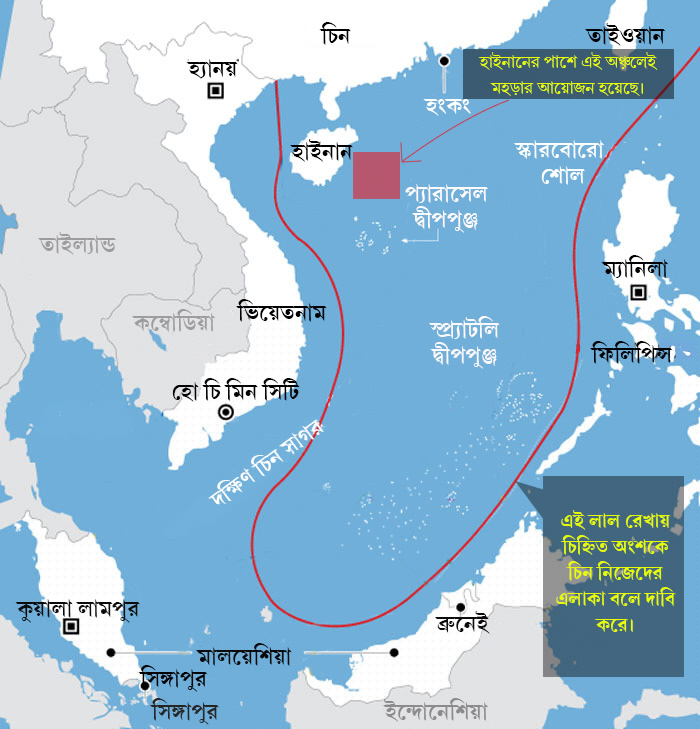 আন্তর্জাতিক আদালতের রায় ঘোষিত হয়েছে ১২ জুলাই। রায় ঘোষণার দিন যত কাছে আসছিল, চিন ততই সুর চড়াচ্ছিল। প্যারাসেল এবং স্প্র্যাটলির কাছে যুদ্ধজাহাজ পাঠিয়ে, তা থেকে ক্ষেপণাস্ত্র ছুড়ে মহড়া দেওয়া শুরু করেছিল। রায় ঘোষিত হওয়ার পরে বেজিং-এর হুঙ্কার আরও বেড়ে যায়। আন্তর্জাতিক ট্রাইবুনালের রায়কে ‘বাতিল কাগজে দিস্তা’ ছাড়া চিন আর কিছুই মনে করছে না, জানায় বেজিং। চিনের এই আচরণকে বিশ্বের কোনও বড় শক্তিই সমর্থন জানায়নি। তা সত্ত্বেও চিন অবস্থানে অনড় থাকার বার্তা দিচ্ছিল। এই উত্তপ্ত পরিস্থিতির মধ্যে দক্ষিণ চিন সাগরে নৌ-মহড়া দেওয়ার কথাও ঘোষণা করে বেজিং। কিন্তু নৌ-মহড়ার জন্য যে অঞ্চলকে বেছে নিয়েছে, তারা, তাতে ওয়াকিবহাল মহল মনে করছে, চিন সুর নরম করতে শুরু করেছে। বিতর্ক সবচেয়ে তীব্র যে অঞ্চলকে নিয়ে, সেখানে গিয়ে শক্তি প্রদর্শন করা থেকে আপাতত বিরতই থাকছে বেজিং।