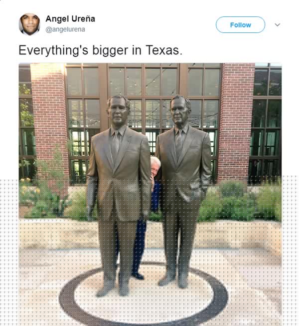 বিষয়টা এ বার সবিস্তার বলা যাক। ডালাসের এই প্রেসিডেন্সিয়াল লিডারশিপ অনুষ্ঠানটি ছিল জর্জ ডব্লু বুশ প্রেসিডেন্সিয়াল সেন্টারে। সেখানে পাশাপাশি দুই প্রাক্তন প্রেসিডেন্ট জর্জ বুশ এবং এইচ ডব্লিউ বুশের দু’টি মূর্তি রয়েছে। অনুষ্ঠান শেষে ওই দুই বুশ-মূর্তির মাঝে দাঁড়িয়ে নেহাত মজা করেই ছবিটা তোলেন বিল। তাঁর মিডিয়া সচিব অ্যাঞ্জেল উরেনা এই ছবিটা তুলে টুইটারে পোস্ট করেছিলেন। বিল ক্লিন্টন ছবিটার নীচে পোস্ট করেন, ‘‘নোট: মাপতে যাবেন না।’’