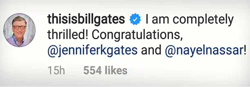 শেষপর্যন্ত সেই নায়েলকেই বিয়ের সিদ্ধান্ত নেন জেনিফার। আর তিনি ইনস্টাগ্রামে সেই ঘোষণা করতেই প্রতিক্রিয়া দিতে সময় নেননি বিল গেটস। মেয়ে জেনিফার ও হবু জামাই-এর সম্পর্ক মেনে নিয়েছেন। বিষয়টি নিয়ে তিনি যে বেশ নায়েলকে শুভেচ্ছা জানিয়েছেন।