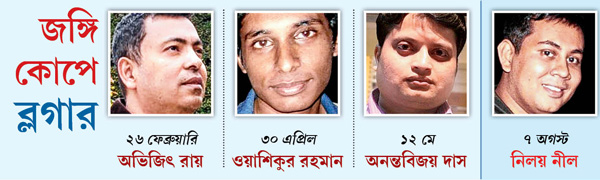 ছ’মাসের মধ্যে চার জন। অভিজিৎ রায়। ওয়াশিকুর রহমান। অনন্তবিজয় দাস। এবং আজ নীলাদ্রি চট্টোপাধ্যায়— ক্রমেই দীর্ঘ হচ্ছে তালিকাটা। বাংলাদেশে কট্টরপন্থীদের রোষের মুখে একের পর এক ব্লগার খুন নিয়ে বিশ্ব জুড়ে সমালোচনা হলেও প্রশাসন কোনও ভাবেই হিংসা বন্ধ করতে পারেনি। এ বার দুষ্কৃতীরা নীলাদ্রি চট্টোপাধ্যায় নামে ওই ব্লগারের বাড়িতে সরাসরি ঢুকে তাঁকে একই কায়দায় কুপিয়ে খুন করে চলে গিয়েছে বলে অভিযোগ।