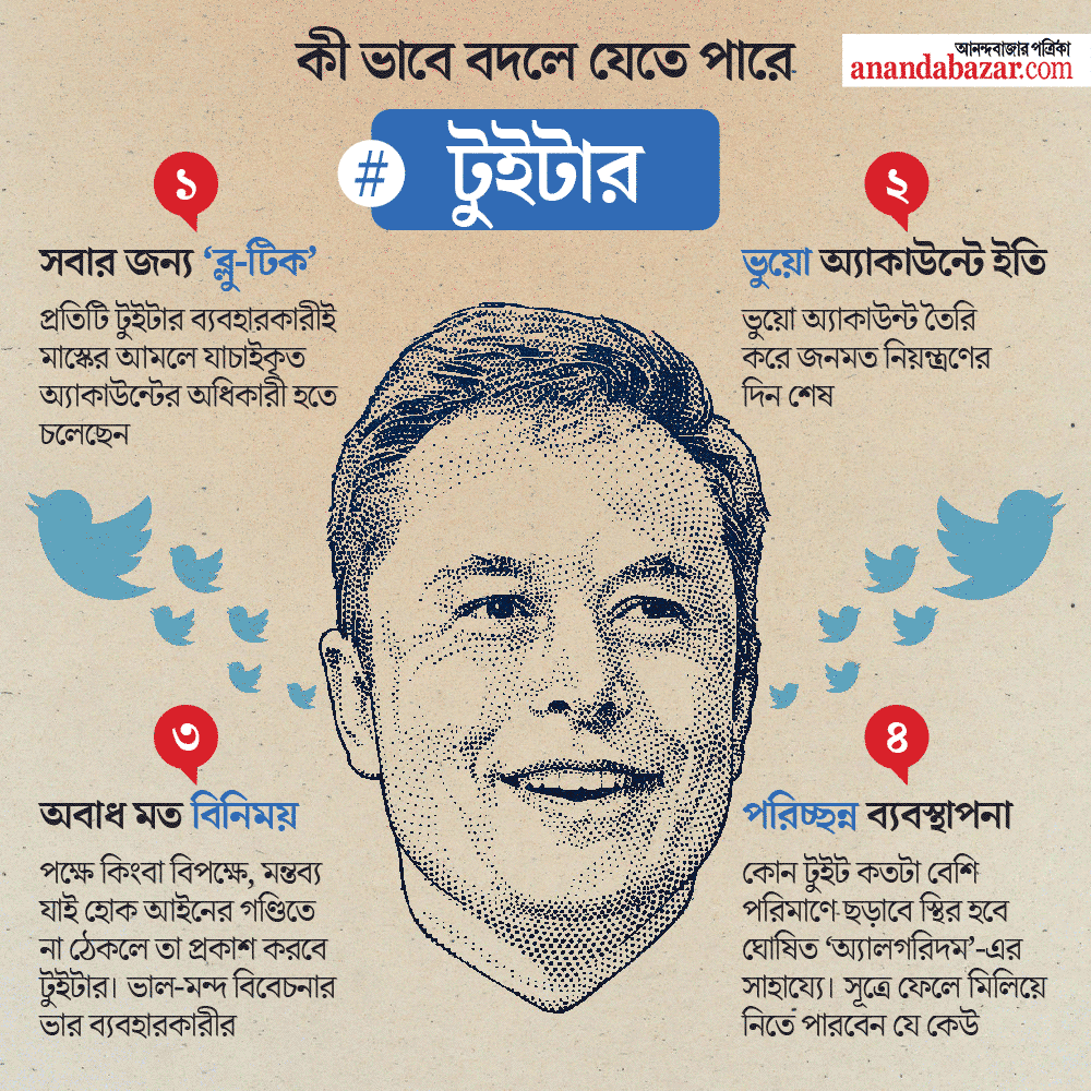 বিস্তর দর দস্তুরের পর ৪,৪০০ কোটি ডলার, অর্থাৎ ভারতীয় মুদ্রায় প্রায় ৩,৩৬, ৯৪১ কোটি ২২ লাখ টাকায় টুইটার কেনা নিশ্চিত করেছেন ইলন মাস্ক। এ বার পালা মাস্কের হাতে পুরনো নিয়ম কানুন বদলের। সবাইকে চমকে দিয়ে টুইটার কিনে ফেলার পর বর্তমানে বিশ্বের অন্যতম ধনকুবের মাস্কের এই মাইক্রো ব্লগিং সাইটটি নিয়ে রয়েছে বিস্তর পরিকল্পনাও। যা আপাতত রয়েছে মস্তিষ্কের সুরক্ষিত কুঠুরিতে। কিন্তু কিছু কিছু বদল যে অবধারিত, তা ইতিমধ্যেই জানা যাচ্ছে। আসুন, জেনে নেওয়া যাক কী সেই বদল, মাস্কের দাবি অনুযায়ী, যা বদলে দেবে ব্যবহারকারীর টুইটারের প্রতি চিরাচরিত দৃষ্টিভঙ্গি।