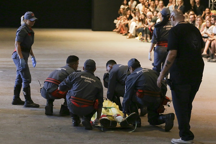 সাও পাওলো ফ্যাশন উইকের র্যাম্প থেকে তুলে নিয়ে যাওয়া হচ্ছে ব্রজিলীয় মডেলকে। ছবি: এপি।