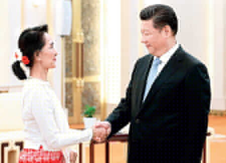 চিনের প্রেসিডেন্ট শি চিনফিং-এর সঙ্গে দেখা করলেন মায়ানমারের নেত্রী আউন সাং সু চি। বৃহস্পতিবার বেজিংয়ে। ছবি: রয়টার্স ।