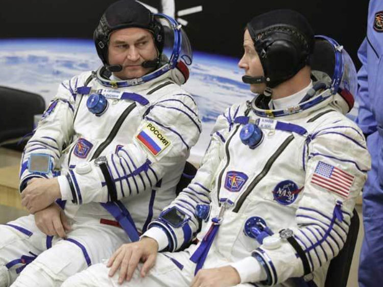 তখনও রকেট উৎক্ষেপণ হয়নি। অপেক্ষায় সয়ুজ মহাকাশযানের দুই মহাকাশচারী নিক হেগ (বাঁ দিকে) ও অ্যালেক্সেই ওভচিনিন। কাজাখস্তানের বৈকানুরে। বৃহস্পতিবার