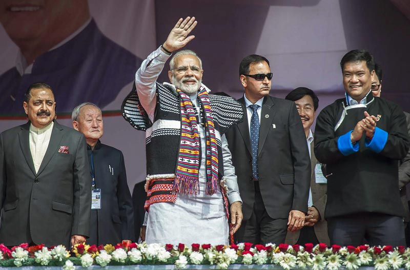 বৃহস্পতিবার ইটানগরে সমাবেশ করেছেন মোদী। উন্নয়নের জন্য অরুণাচলকে বা উত্তর-পূর্ব ভারতকে বার বার দিল্লিতে ছুটতে হবে না, দিল্লিই পৌঁছবে উত্তর-পূর্বে— এমন বার্তাও দিলেন। ছবি: পিটিআই।