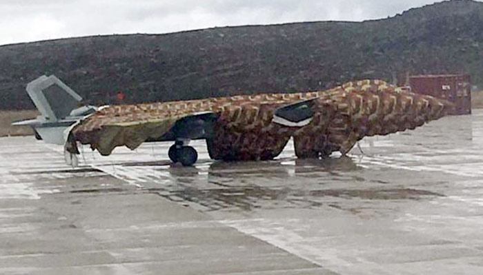 এই ভাবেই ঢেকে রাখা হয়েছে যুদ্ধবিমানটিকে। ছবি: টুইটার।