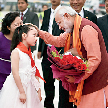 চিনের শিয়ান আন্তর্জাতিক বিমানবন্দরে প্রধানমন্ত্রী নরেন্দ্র মোদীকে স্বাগত জানাচ্ছে এক খুদে। বৃহস্পতিবার।