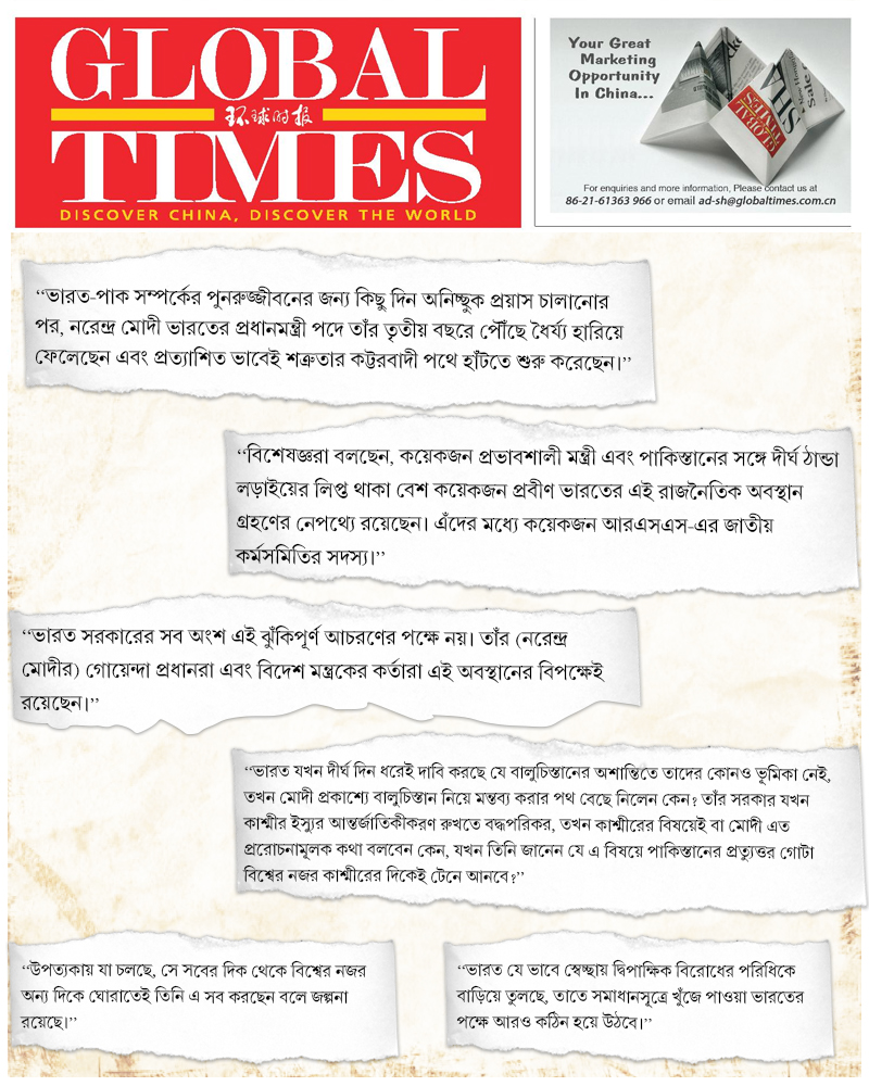 এই প্রথম চিনের সরকারি মিডিয়া বালুচিস্তান প্রসঙ্গে নরেন্দ্র মোদীর মন্তব্য সম্পর্কে কোনও মত প্রকাশ করল। বালুচিস্তান প্রসঙ্গে মোদী তথা ভারত সরকারের যে অবস্থান, সে প্রসঙ্গে চিনা কূটনীতিকরা গত কয়েক দিন ধরে ব্যক্তিগত মত প্রকাশ করছিলেন। সেই মতামতেও মোদীর সমালোচনাই ছিল। কিন্তু সরকারি ভাবে এত দিন পর্যন্ত বেজিং মোদীকে বা ভারতকে কোনও প্রত্যক্ষ আক্রমণ করেনি। মঙ্গলবার গ্লোবাল টাইমসে যে প্রতিবেদন প্রকাশিত হল, তাতে চিনা সরকারের অবস্থানে আর কোনও রাখঢাক রইল না। অত্যন্ত কঠোর ভাষায় আক্রমণ করা হল ভারতের প্রধানমন্ত্রীকে।