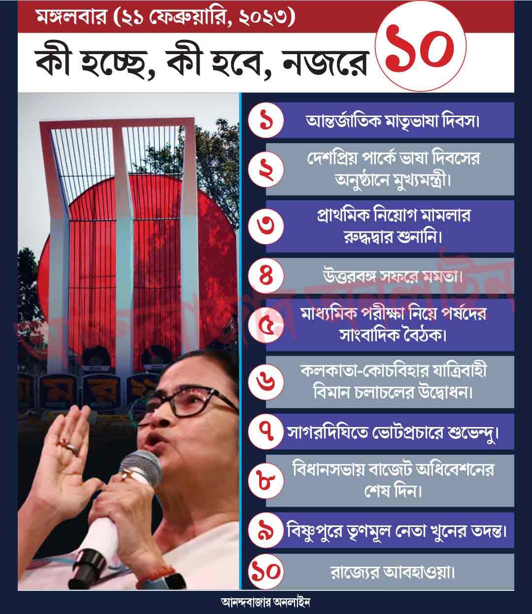 আজ ভাষা দিবস উপলক্ষে দেশপ্রিয় পার্কের অনুষ্ঠানে থাকার কথা মুখ্যমন্ত্রী মমতা বন্দ্যোপাধ্যায়ের। দুপুর ১২টা নাগাদ এই অনুষ্ঠানে যাবেন তিনি। এই অনুষ্ঠান শেষে উত্তরবঙ্গের উদ্দেশে রওনা দেবেন মমতা।