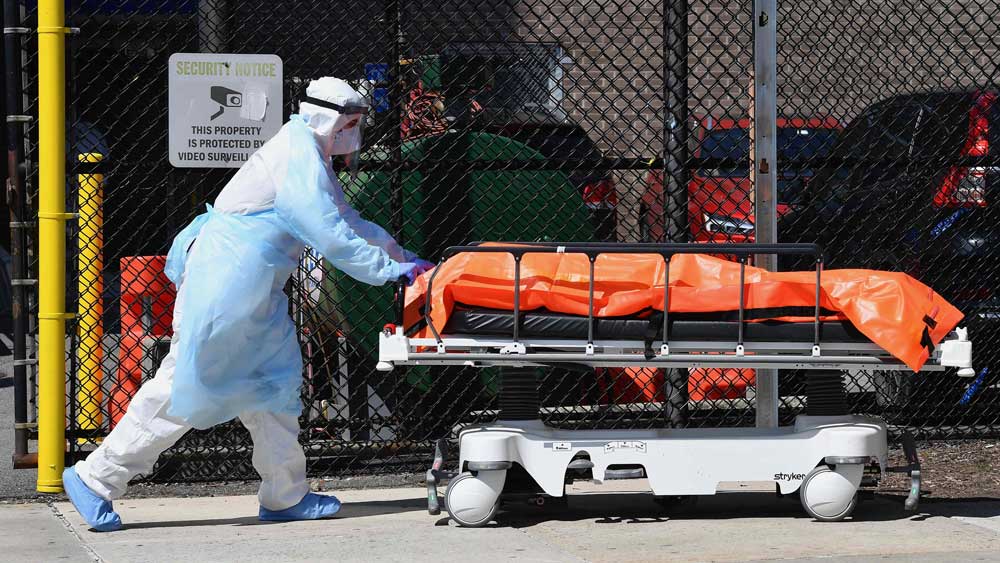 উইকঅফ হাইটস মেডিক্যাল সেন্টার থেকে সরানো হচ্ছে দেহ। ছবি: এএফপি