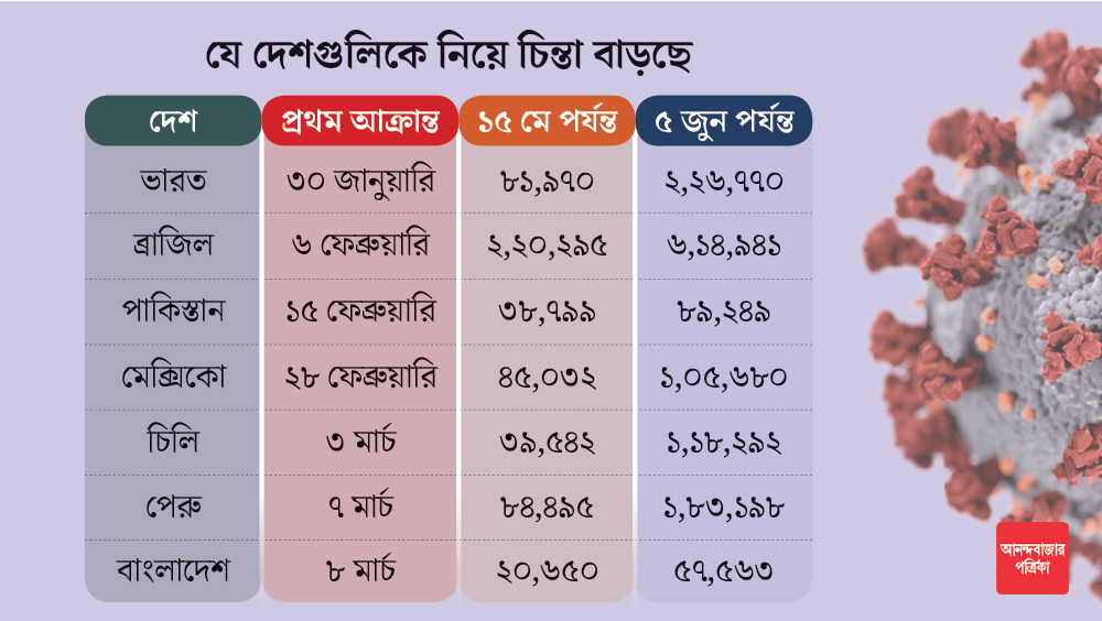 যে দেশগুলিতে সম্প্রতি সংক্রমণ বেড়েছে, তার মধ্যে রয়েছে পেরু, বাংলাদেশ, পাকিস্তান এবং ভারতের মতো দেশ। এতেই উদ্বেগ প্রকাশ করেছেন বিশেষজ্ঞরা। জানুয়ারির শেষ দিকে ভারতে প্রথম করোনা হানা দেয়। গত ১৫ মে পর্যন্ত দেশে সব মিলিয়ে আক্রান্তের সংখ্যা ছিল ৮১ হাজার ৯৭০। কিন্তু শুক্রবার তা ২ লক্ষ ২৬ হাজার ৭৭০-তে এসে ঠেকেছে। নোভেল করোনার প্রভাবে ভারতে এখনও পর্যন্ত ৬ হাজার ৩৬৩ জনের মৃত্যু হয়েছে। তবে প্রতিদিন যে হারে আক্রান্তের সংখ্যা বেড়ে চলেছে, তাতে উদ্বেগে নয়াদিল্লিও।