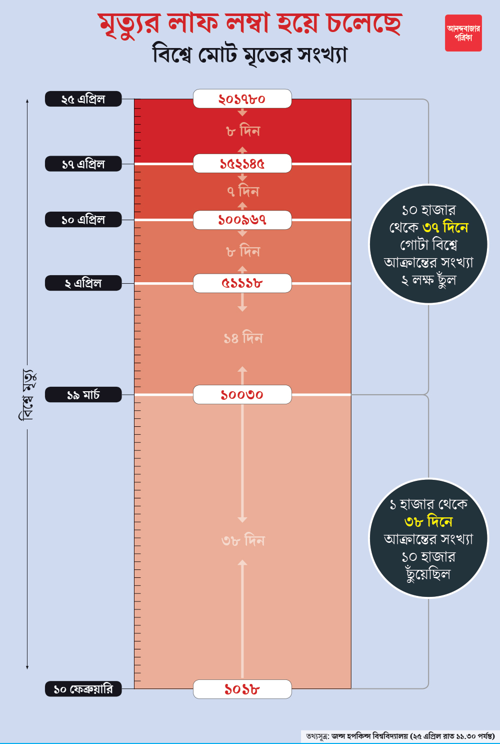 গত ১০ ফেব্রুয়ারি বিশ্ব জুড়ে করোনায় মৃতের সংখ্যা ছিল ১,০১৮। তার ৩৮ দিন পর, ১৯ মার্চ মৃতের সংখ্যা ১০ হাজার ছাড়ায়। এর পর ১০ হাজার থেকে ৫০ হাজারের সীমা পার করতে এই ভাইরাসের সময় লেগেছিল মাত্র ১৪ দিন। ২ এপ্রিল মৃতের সংখ্যা বেড়ে হয়েছিল ৫১ হাজার ১১৮। এর পরের ৮ দিনেই তা চলে যায় ১ লক্ষের ঘরে। ১ লক্ষ থেকে মাত্র ৭ দিনে দেড় লক্ষের কোটায় ঢুকে পড়ে ম়ৃত্যু। তার পর ৮ দিন সময় লাগল ২ লক্ষ পেরোতে। অর্থাৎ বিশ্বের করোনায় মৃত্যু ১ হাজার থেকে ১০ হাজার হতে সময় নিয়েছিল ৩৮ দিন। তার পরের ৩৭ দিনে এই ভাইরাসে মৃতের মোট সংখ্যাটা ছাড়িয়ে গেল ২ লক্ষ। আপাতত প্রতিষেধকহীন এই ভাইরাস এ ভাবেই গতি বাড়িয়ে শিকার করে চলেছে প্রতিনিয়ত।
