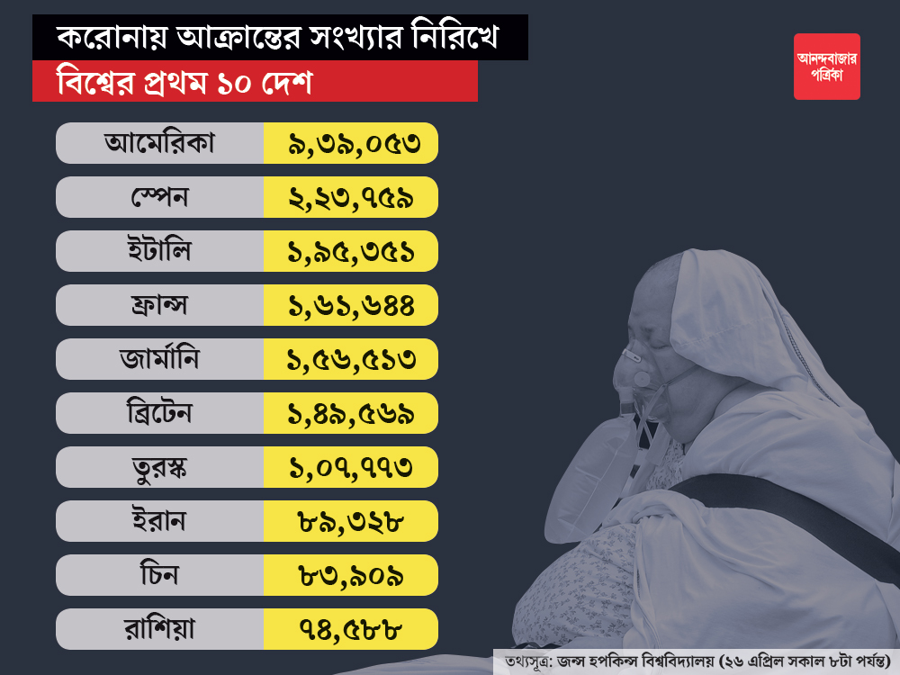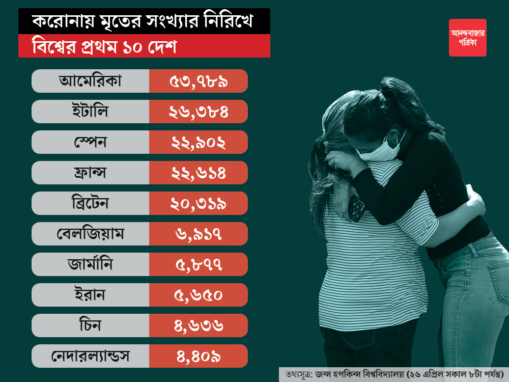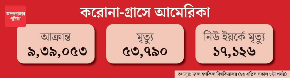 কোভিড-১৯-এর শিকার সবচেয়ে বেশি আমেরিকায়। জন্স হপকিন্স ইউনিভারসিটির পরিসংখ্যান অনুযায়ী, এই প্রতিবেদন প্রকাশের সময় সে দেশে মোট আক্রান্তের সংখ্যা ১০ লক্ষের দিকে এগচ্ছে। মৃতের সংখ্যা ছুঁতে চলেছে ৫৪ হাজার। শুধুমাত্র নিউ ইয়র্ক শহরেই মৃতের সংখ্যা ১৮ হাজারের কাছাকাছি।