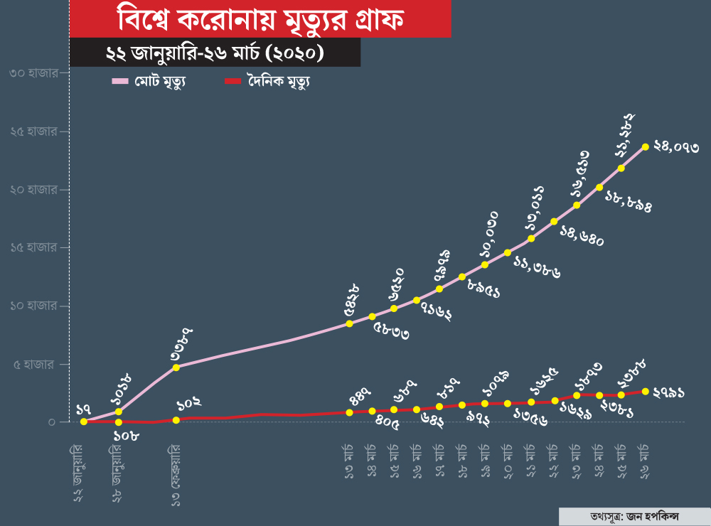 আবার মৃত ও আক্রান্তের সংখ্যা প্রতিদিন যে ভাবে বাড়ছে, তাতেও শঙ্কার আবহ গোটা বিশ্বেই। গত ২২ জানুয়ারি থেকে পরিসংখ্যান ঘেঁটে দেখা যাচ্ছে আক্রান্তের সংখ্যা প্রতিদিন প্রায় দ্বিগুণ হারে বেড়েছে। কয়েক দিন আবার বৃদ্ধির হার পৌঁছে গিয়েছে তিন গুণ বা তারও বেশি। মৃতের সংখ্যাতেও একই রকম পরিসংখ্যান। ২৫ মার্চ এক দিনে নতুন আক্রান্তের সংখ্যা বৃদ্ধি পেয়েছে ৪৯ হাজার ৭০০ জন। মৃতের সংখ্যা বেড়েছে ২৩৮৮। গতকাল বৃহস্পতিবার নতুন করে আক্রান্ত হয়েছেন ৬১ হাজার ৯০০ জন। মৃত্যু হয়েছে ২৭৯১ জনের। শুক্রবারের পুরো হিসেব পাওয়া যায়নি।