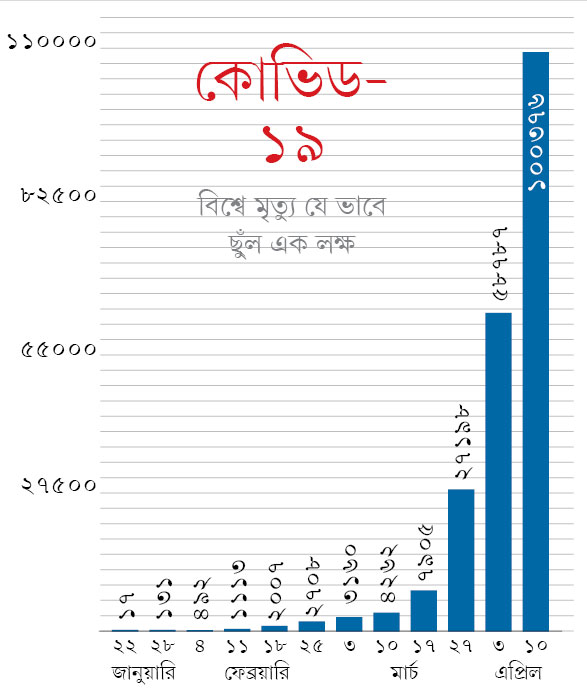 নিউ ইয়র্ক থেকে নয়াদিল্লি, গৃহবন্দি কয়েকশো কোটি মানুষ। গোটা বিশ্বে থমকে ব্যবসাবাণিজ্য। ১৭ লক্ষ লোক সংক্রমিত। মারা গিয়েছেন ১ লক্ষ ৬ হাজারেরও বেশি। সব চেয়ে ভয়াবহ অবস্থা ইউরোপের, বিশেষ করে ইটালি, স্পেন, ফ্রান্সের। ফ্রান্সেও শুক্রবার হাজারের কাছাকাছি মৃত্যু হয়েছে। ব্রিটেন থেকে নতুন করে ৯৮০ জনের মৃত্যুর খবর মিলেছে। তবে বর্তমানে করোনার ভরকেন্দ্র আমেরিকা। সংক্রমণের রেখা সেখানে ঊর্ধ্বমুখী। বৃহস্পতিবার ১৭০০ জন মারা যান ডোনাল্ড ট্রাম্পের দেশে। শুক্রবার ২১০৮ জন। আর আজ ১৩৮৮ জন। পরপর তিন দিনে মৃতের সংখ্যা ২০ হাজার ছাড়িয়েছে সেখানে। মার্কিন মুলুকে কোভিড-১৯-এ আক্রান্ত হয়ে কমপক্ষে ৪০ জন ভারতীয় বংশোদ্ভূতের মৃত্যু হয়েছে। করোনা পজ়িটিভ দেড় হাজারেরও বেশি ভারতীয়-মার্কিন।