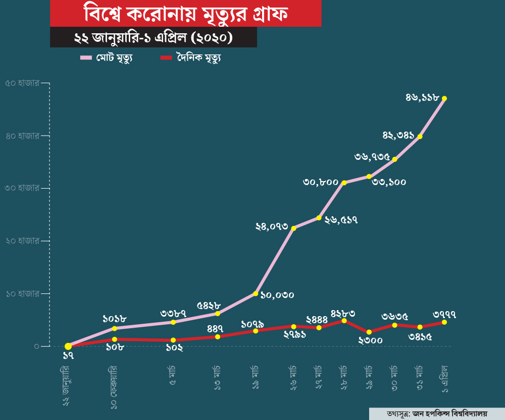 করোনা যেন অভিশাপ। সংক্রমণে লাগাম তো দূর অস্ত, যত দিন গড়াচ্ছে ততই বা়ডছে মৃত্যুর সংখ্যা। করোনায় মৃত্যুর সংখ্যায় বুধবার নতুন মাইলস্টোন ছুঁয়ে ফেলল আমেরিকা, স্পেন ও ইংল্যান্ড। ওই তিনটি দেশেই ওই দিন সবচেয়ে বেশি মানুষের মৃত্যু হয়েছে। জন হপকিন্স বিশ্ববিদ্যালয়ের তথ্য অনুযায়ী, পৃথিবী জুড়ে করোনা সংক্রমণে মৃতের সংখ্যা ৪৮ হাজার ছাড়িয়ে গিয়েছে। আক্রান্ত হয়েছেন সাড়ে ৯ লক্ষেরও বেশি মানুষ।