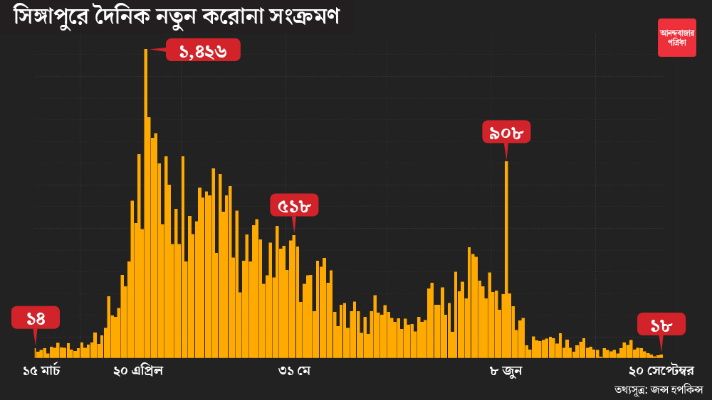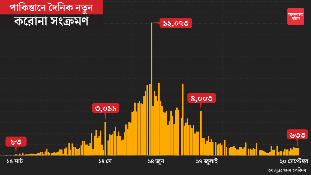 অর্থাৎ পরিসংখ্যান জানাচ্ছে কোভিড অতিমারি রুখে দিয়ে অসাধারণ ভাল পরিস্থিতিতে আমাদের পড়শি দেশ। সেই কারণেই তো হু বলেছে পাকিস্তানের কাছ থেকে শিখতে। পোলিও দূরীকরণে সে দেশ যে ভাবে কাজ করেছে, সেই রাস্তায় শিক্ষা নিয়েই নাকি তারা অতিমারি সামলাচ্ছে। কিন্তু এই অতি সরলীকরণ খুব সহজে মেনে নেওয়া যাচ্ছে না, এবং ভুরুর ভাঁজ বাড়ছে। সে আলোচনায় ঢোকার আগে একবার ঘুরে আসা যাক সিঙ্গাপুর থেকে। কারণ সে দেশের তথ্যের উপর বিশ্বাস করে সব দেশ। স্বচ্ছ ভাবে সেখানকার আকাশপাতায় প্রতিদিন জানানো হয় সংক্রমণ, সুস্থতা এবং মৃত্যুর খবর। অবশ্যই দেশ হিসেবে ভীষণ ছোট সিঙ্গাপুর। আমাদের কোনও কোনও শহরের থেকেও আয়তন বা জনসংখ্যায় কম। তবে এটা বুঝতে হবে যে জনঘনত্ব সে দেশে যথেষ্ট বেশি। তা ছাড়া, কয়েকটি অঞ্চলে গা ঘেঁষাঘেঁষি করে থাকেন ভারত, পাকিস্তান, বাংলাদেশ এই সব দেশ থেকে কায়িক শ্রম বেচতে যাওয়া নিম্নবিত্ত মানুষ। সেই জায়গায় অসাধারণ দক্ষতায় পরিস্থিতি সামাল দিয়েছে সেখানকার সরকার। দেশটা উন্নত, সেখানকার মন্ত্রীরা সকলেই উচ্চশিক্ষিত, আইনের শাসন কঠিন, গণতন্ত্র ততটা নেই (সূচকে ভারতের থেকে নীচে)। ফলে অত্যন্ত অল্পসংখ্যক মৃত্যু, এবং এই সময় প্রায় কোভিড সংক্রমণ-মুক্ত সিঙ্গাপুর সব দেশের কাছেই মডেল। তাদের মূল চ্যালেঞ্জ এখন দেশের সীমানা খুলে দেওয়া। বিদেশ থেকে হাজার হাজার মানুষ সিঙ্গাপুরে ঢুকলে যে কী পরিস্থিতি দাঁড়াবে তা খুব পরিষ্কার নয়। এখনও সেখানে বিদেশ থেকে লোকজন ঢুকছেন, তবে তা সীমিত মাত্রায়।