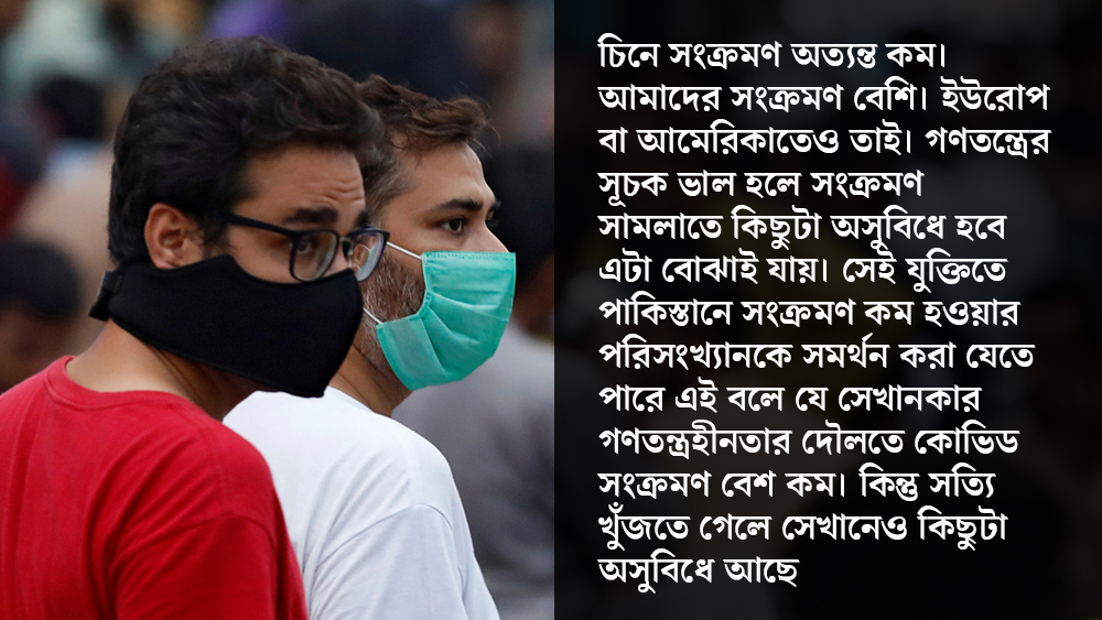 অর্থাৎ এখানে যে ষড়যন্ত্র তত্ত্বটা আসছে তা হল— ভারতকে চাপে রাখার জন্যে চিন এই রাস্তাটা নিচ্ছে কিনা, যেখানে পাকিস্তান সরকারের কৃতিত্ব ফলাও করে দেখানো হচ্ছে অতিমারির দিনগুলিতে। মার্কিন দেশ থেকে বারবার অভিযোগ এসেছে যে চিনের সঙ্গে হু-এর টেবিলের তলায় প্রচুর আঁতাত। নেহাত ট্রাম্প সম্পর্কে বুদ্ধিজীবীদের ধারণা নেতিবাচক, তাই এই অভিযোগ বিশেষ মান্যতা পায়নি। কিন্তু এটা তো একেবারে সত্যি যে বিশ্ব জুড়ে সংক্রমণ ছড়ানোর মূল পাণ্ডা চিন এবং হু তখন অতিদ্রুত কোনও পদক্ষেপ নেয়নি। তারা শুরুতেই সাবধান হলে এ ঘটনা ঘটত না। চিনে গণতন্ত্র সূচক দুনিয়ায় একেবারে নীচের দিকে, সেখানকার তথ্যও বিশ্ব জুড়ে খুব বিশ্বাসযোগ্য নয়। তর্কের খাতিরে এটুকু মেনে নেওয়া যেতেই পারে যে একনায়কতন্ত্রের বজ্রমুষ্টিতে তারা দক্ষ হাতে কোভিড সামলেছে। এখন তাই গণপ্রজাতন্ত্রী চিনে সংক্রমণ অত্যন্ত কম। কিন্তু ভারতের মত গণতান্ত্রিক দেশে জনগণকে চাবকে ঠান্ডা করে রাখার তত্ত্ব কাজ করে না। সেই হিসেবে আমাদের সংক্রমণ কিছুটা বেশি হবেই। ইউরোপ বা আমেরিকাতেও তাই ঘটেছে। অর্থাৎ গণতন্ত্রের সূচক ভাল হলে সংক্রমণ সামলাতে কিছুটা অসুবিধে হবে এটা বোঝাই যায়। সেই যুক্তিতে পাকিস্তানে সংক্রমণ কম হওয়ার পরিসংখ্যানকে সমর্থন করা যেতে পারে এই বলে যে সেখানকার গণতন্ত্রহীনতার দৌলতে কোভিড সংক্রমণ বেশ কম। কিন্তু সত্যি খুঁজতে গেলে সেখানেও কিছুটা অসুবিধে আছে।