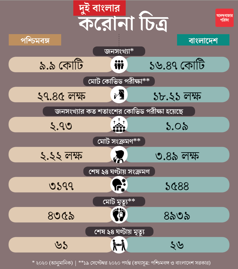 একই তুলনা আসে পশ্চিমবঙ্গ আর বাংলাদেশের ক্ষেত্রেও। বেশি অঙ্ক কষে লাভ নেই, তবে বিভিন্ন পরিসংখ্যান দেখে আপাতদৃষ্টিতে মনে হচ্ছে বাংলাদেশের অবস্থা যেন পশ্চিমবঙ্গের তুলনায় অনেকটা ভাল। বাংলাদেশে ষোল কোটির বেশি মানুষ, পশ্চিমবঙ্গে দশ কোটির কাছাকাছি। কিন্তু সংক্রমণ এবং মৃত্যুতে ওপার বাংলার পরিসংখ্যান এপার বাংলার থেকে কম। রাজনৈতিক এবং আর্থসামাজিক পরিস্থিতিতে এমনটা কিন্তু হওয়ার কথা নয়।