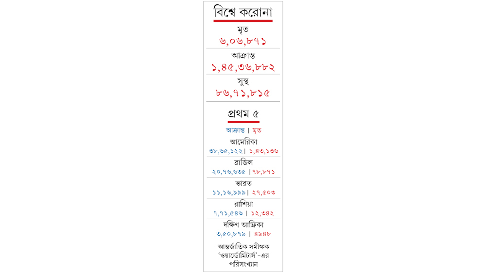 দৈনিক সংক্রমণ রেকর্ড ছোঁয়ায় আইসোলেশন পরিষেবা আরও উন্নত করা হচ্ছে হংকংয়ে। নেত্রী ক্যারি ল্যাম জানিয়েছেন, আরও ২০০০ কোয়রান্টিন সেন্টার তৈরি হবে হংকং ডিজ়নিল্যান্ডের কাছে। স্ক্রিনিং নিয়ে কেলেঙ্কারির জেরে বাংলাদেশে করোনা-পরীক্ষার হার প্রায় অর্ধেক হয়ে গিয়েছে বলে জানাল স্বাস্থ্য মন্ত্রক। গত মাসের শেষে যেখানে ১৮ হাজার মানুষের পরীক্ষা হয়েছে, সেখানে গত দু’সপ্তাহে পরীক্ষা হয়েছে ১০ হাজার মানুষের। সম্প্রতি কয়েক হাজার রোগীর পরীক্ষা না করেই তাঁরা ভাইরাস-মুক্ত বলে ভুয়ো সার্টিফিকেট দেওয়ার অভিযোগে ঢাকা হাসপাতালের এক চিকিৎসক-সহ বেশ কয়েক জন গ্রেফতার হয়েছে। স্বাস্থ্য মন্ত্রকের এক আধিকারিক বলছেন, ‘‘এখানে মানুষের মধ্যে থেকে যেন ভয়টাই উড়ে গিয়েছে।’’