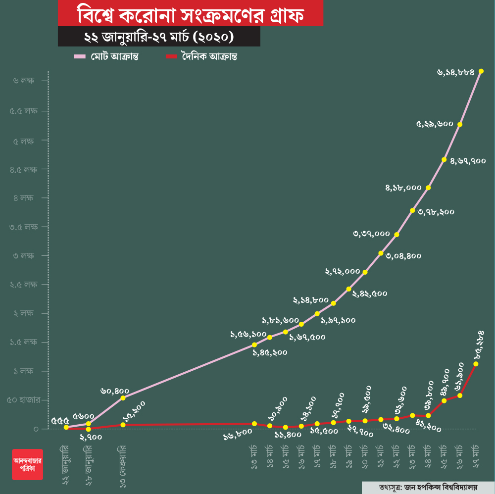 বিশ্ব জুড়ে লাফিয়ে লাফিয়ে বাড়ছে করোনা সংক্রমণ। আর পাল্লা দিয়ে বাড়ছে বাড়ছে মৃত্যুও। সারা পৃথিবীতে শুধু মাত্র এক দিনেই করোনায় মৃত্যু হয়েছে ৩ হাজারেরও বেশি মানুষের। এর বেশির ভাগটাই ইটালি ও স্পেনে। সব মিলিয়ে করোনায় এখনও পর্যন্ত মৃতের সংখ্যা দুনিয়া জুড়ে ৩০ হাজারের গণ্ডি পেরিয়ে গিয়েছে। গোটা বিশ্বে করোনায় আক্রান্তের সংখ্যা সাড়ে ৬ লক্ষ ছাড়িয়ে গিয়েছে। সবচেয়ে উদ্বেগজনক অবস্থা আমেরিকা, স্পেন ও ইটালি। ওই তিন দেশেই একলাফে আক্রান্তের সংখ্যা বৃদ্ধি পেয়েছে অনেকটাই।