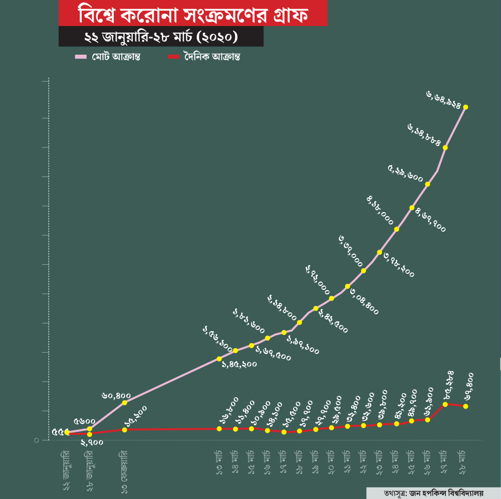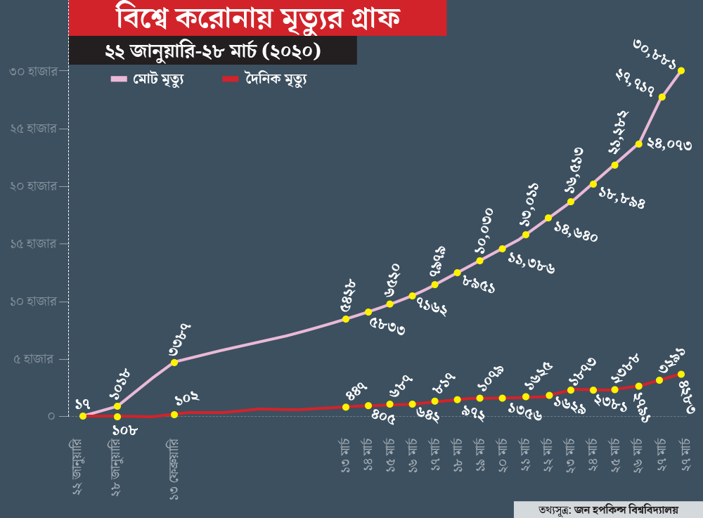 কোনওমতেই রাশ টানা যাচ্ছে না। করোনায় বিশ্ব জুড়ে লাফিয়ে লাফিয়ে বাড়ছে সংক্রমণ। আর তার ফলে মৃত্যুর সংখ্যাও পাল্লা দিয়ে বাড়ছে দুনিয়া জুড়ে। মৃতের সংখ্যা ইতিমধ্যেই ৩৩ হাজারের গণ্ডি পেরিয়ে গিয়েছে। ইটালিতে মৃতের সংখ্যা ১০ হাজার ছাড়িয়ে গিয়েছে। সাড়ে ৬ হাজারেরও বেশি মানুষের মৃত্যু হয়েছে স্পেনে। গোটা পৃথিবীতে করোনা আক্রান্তের সংখ্যা ৭ লক্ষ ছাড়িয়ে গিয়েছে। তবে আশার খবর, সুস্থও হয়ে উঠেছেন প্রায় দেড় লক্ষ মানুষ।