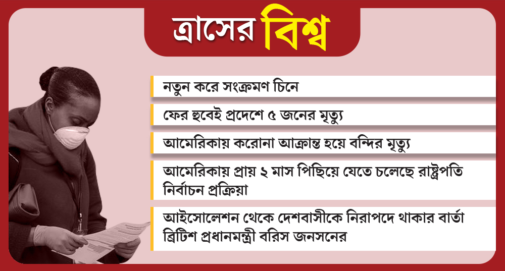পৃথিবী জুড়ে অন্তত ১৭৭টি দেশে তাণ্ডব চালাচ্ছে করোনাভাইরাস। এই মুহূর্তে পরিস্থিতি সবচেয়ে উদ্বেগজনক আমেরিকায়। সেখানে করোনায় আক্রান্ত হয়েছেন ১ লক্ষ ২৪ হাজারেরও বেশি। মৃত্যু হয়েছে ২ হাজারের বেশি মানুষের। এর মধ্যে শুধু মাত্র নিউ ইয়র্ক শহরেই মারা গিয়েছেন সাড়ে ছ’শোর বেশি মানুষ। এর মধ্যেই নতুন করে আশঙ্কা দেখা দিয়েছে চিনের হুবেই প্রদেশে। সেখানে ফের ৫ জনের মৃত্যু হয়েছে করোনায়। চিনে নতুন করে আক্রান্তের সংখ্যাও কিছুটা বেড়েছে। হুবেই প্রদেশের উহানেই প্রথম থাবা বসিয়েছিল করোনা। সংক্রমণের ফলে লাফিয়ে লাফিয়ে মৃত্যু বাড়ছে ইরান ও ফ্রান্সেও। জার্মানিতেও থাবা বসিয়েছে করোনা। সেখানে আক্রান্ত হয়েছেন ৫৮ হাজারের বেশি মানুষ।