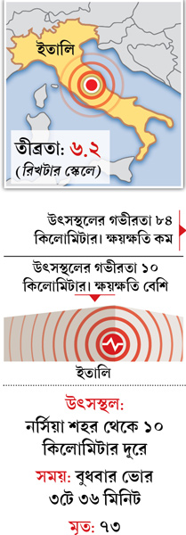 তীব্রতা এত কম হওয়া সত্ত্বেও স্রেফ গভীরতার অভাবে এমন বিপর্যয়ের কারণ কী? বিজ্ঞানীরা জানাচ্ছেন, ভূগর্ভে একটি প্লেট যখন অন্য প্লেটের তলায় ছেঁচড়ে ঢোকে, তখনই ভূমিকম্প দেখা দেয়। ইতালি এ দিন কেঁপেছে ইউরেশীয় ও আফ্রিকা প্লেটের ঘর্ষণে। ওই তল্লাটে ইউরেশীয় প্লেট বছরে ২৫ মিলিমিটার গতিতে আফ্রিকা প্লেটের তলায় ঢুকছে। ভূ-বিজ্ঞানী সুগত হাজরার ব্যাখ্যা: প্লেটের এই সরণ কখনও বাধা পেয়ে আটকে থাকে। তাতে উৎসস্থলে ক্রমশ চাপ বাড়তে থাকে, সঞ্চিত হতে থাকে শক্তি। ক্রমাগত চাপের মুখে বাধা সরে গেলে সঞ্চিত শক্তি ঠিকরে বেরিয়ে আসে। উৎসস্থল ভূপৃষ্ঠের অনেক নীচে থাকলে সেই শক্তি ভূস্তরে পৌঁছতে পৌঁছতে অনেকটা কমজোরি হয়ে পড়ে। তাতে ক্ষতি হয় কম। আর উল্টোটা হলেই সর্বনাশ।