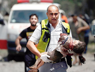 প্যালেস্তাইনি শিশুর ক্ষত বিক্ষত দেহ কোলে ডাক্তারের খোঁজে দৌড়।