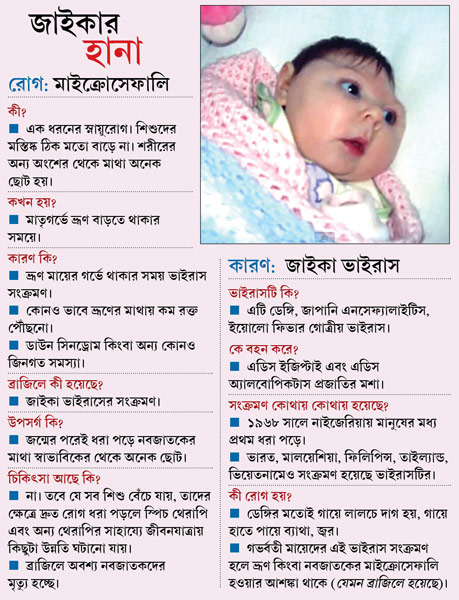 ব্রাজিলে জাইকা বয়ে এনেছে স্নায়ুরোগ মাইক্রোসেফালি। বিজ্ঞানীদের সন্দেহ, অন্তঃসত্ত্বা মায়ের শরীরে জাইকা সংক্রমণ ঘটলে সন্তান এই রোগ নিয়ে জন্ম নিচ্ছে। নীরবে সেই সংক্রমণ ঘটিয়ে চলেছে এডিস মশা। ফলে একের পর এক শিশু আক্রান্ত হচ্ছে মাইক্রোসেফালিতে। আর তাই পরিস্থিতি সামলাতে না পেরে বাধ্য হয়ে প্রশাসন নির্দেশিকা জারি করছে, ‘দয়া করে অন্তঃসত্ত্বা হবেন না’। ব্রাজিলের পরিস্থিতি নিয়ে সতর্কতা জারি করেছে বিশ্ব স্বাস্থ্য সংস্থা (হু)-ও। সাবধান করা হচ্ছে পর্যটকদেরও।