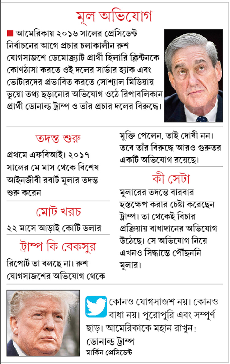 বিশেষ আইনজীবী রবার্ট মুলারের তদন্ত-রিপোর্ট জানিয়েছে, আমেরিকার ভোটে প্রেসিডেন্ট ডোনাল্ড ট্রাম্পের সঙ্গে রুশ যোগসাজশের প্রমাণ মেলেনি। এ দিক থেকে তাই তাঁকে ‘অপরাধী’ বলা যাবে না। তবে প্রেসিডেন্টকে পুরোপুরি ছাড়ও দেওয়া যাচ্ছে না।
