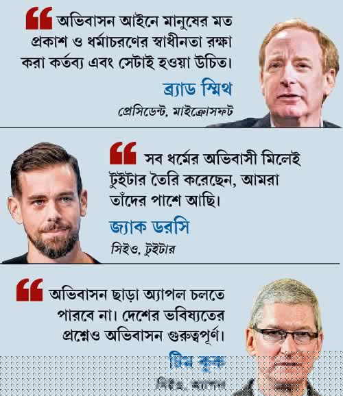 ট্রাম্পের এই নিষেধাজ্ঞা নিয়ে গুগলের সিইও সুন্দর পিচাই, ফেসবুক প্রতিষ্ঠাতা মার্ক জুকেরবার্গের পর এ বার মুখ খুললেন অ্যাপলের সিইও টিম কুক-ও। সহকর্মীদের এক ই-মেল বার্তায় তিনি বলেন, ‘‘এই নীতি আমরা কোনও ভাবেই সমর্থন করি না। অভিবাসন ছাড়া অ্যাপল চলতে পারবে না। অ্যাপল দৃঢ় ভাবে বিশ্বাস করে— দেশের ভবিষ্যতের প্রশ্নেও অভিবাসন খুবই গুরুত্বপূর্ণ।’’ ট্রাম্পের নিষেধাজ্ঞা ভাবাচ্ছে মাইক্রোসফটকেও। সংস্থার প্রেসিডেন্ট ব্র্যাড স্মিথের দাবি, এর প্রভাব পড়বে অন্তত ৭৬ জন কর্মী ও তাঁদের পরিবারের উপর। তিনিও মেল করেছেন তাঁর সহকর্মীদের। তাঁর কথায়, ‘‘আমরা মনে করি, অভিবাসন আইনে মানুষের মত প্রকাশ ও ধর্মাচরণের স্বাধীনতা রক্ষা করা কর্তব্য এবং সেটাই হওয়া উচিত।’’ মার্কিন প্রেসিডেন্টের এই নিষেধাজ্ঞার মানবিক ও অর্থনৈতিক প্রভাব ভয়ানক ও হতাশাজনক বলে মন্তব্য করেছেন টুইটারের সিইও জ্যাক ডরসি-ও।