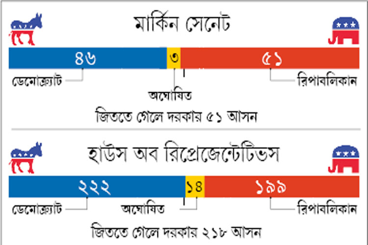 সেনেটে ৫১টি আসন ছিল রিপাবলিকানদের, বাড়তে পারে আরও ৩টি। দেশের এগ্জিকিউটিভ ও বিচার বিভাগীয় পদে নিয়োগ এবং অন্য দেশের সঙ্গে বাণিজ্য চুক্তির রাশ তাই ট্রাম্পের হাতেই। কিন্তু কী হবে মেক্সিকো-সীমান্তে দেওয়ালের? ডেমোক্র্যাটরা হাউসে সংখ্যাগরিষ্ঠ হয়ে যাওয়ায় প্রশ্নটা উঠছেই। কূটনীতিকদের একাংশ বলছেন, স্বাস্থ্য বিমা থেকে অভিবাসন নীতি, নয়া কর ব্যবস্থা নিয়ে ট্রাম্প এত দিন যা করতে চেয়েছেন, তার অনেকটাই আটকে দিতে পারে ডেমোক্র্যাটরা। সে ক্ষেত্রে আইনি জটিলতায় ফাঁসলে ট্রাম্প হয় বিরোধীদের বিরুদ্ধে সুর চড়াবেন, না হয় ঠিক ঘুরপথে রাজি হয়ে যাবেন বিকল্পে! কিছু জনমত সমীক্ষায় বলা হচ্ছিল, কংগ্রেসে ক্ষমতা খোয়ালে ইমপিচমেন্টের মুখে পড়তে হতে পারে প্রেসিডেন্টকে। আপাতত সেটা হচ্ছে না। কারণ, এতে সেনেটেরও দুই-তৃতীয়াংশের সমর্থন প্রয়োজন। তাই শুধু হাউসের দখল নিয়ে ডেমোক্র্যাটরা ট্রাম্পের বিভিন্ন পদক্ষেপে কতটা বাধা দিতে পারবেন, তা নিয়েও প্রশ্ন উঠছে।