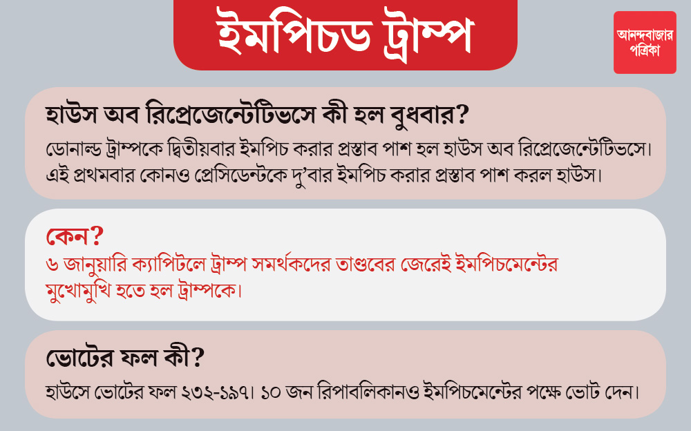আমেরিকান কংগ্রেসের নিম্নকক্ষ বা হাউস অব রিপ্রেজেন্টেটিভস-এ ইমপিচমেন্ট প্রক্রিয়া শেষ হয়েছে। সেখানে ডেমোক্র্যাটরা তো বটেই, রিপাবলিকানদের ১০ জনও ট্রাম্পের বিপক্ষে অর্থাৎ ইমপিচমেন্টের পক্ষে ভোট দিয়েছেন।
