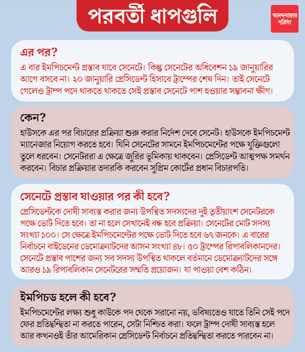 এ বার উচ্চকক্ষ অর্থাৎ সেনেটে যাবে ইমপিচমেন্ট প্রস্তাব। সেখানেও রয়েছে দীর্ঘ প্রক্রিয়া। সেনেটে উপস্থিত দুই তৃতীয়াংশ সদস্যের সমর্থন লাগবেই। সেনেটের মোট সদস্যসংখ্যা ১০০। নিম্নকক্ষে ১০ প্রতিনিধি ট্রাম্পের বিরুদ্ধে বা ইমপিচমেন্টের পক্ষে ভোট দিয়েছেন। কিন্তু দুই-তৃতীয়াংশ সমর্থন পেতে গেলে ডেমোক্র্যাটদের জোগাড় করতে হবে অন্তত আরও ১৯ জন সেনেটরকে। সেই সম্ভাবনা ক্ষীণ।