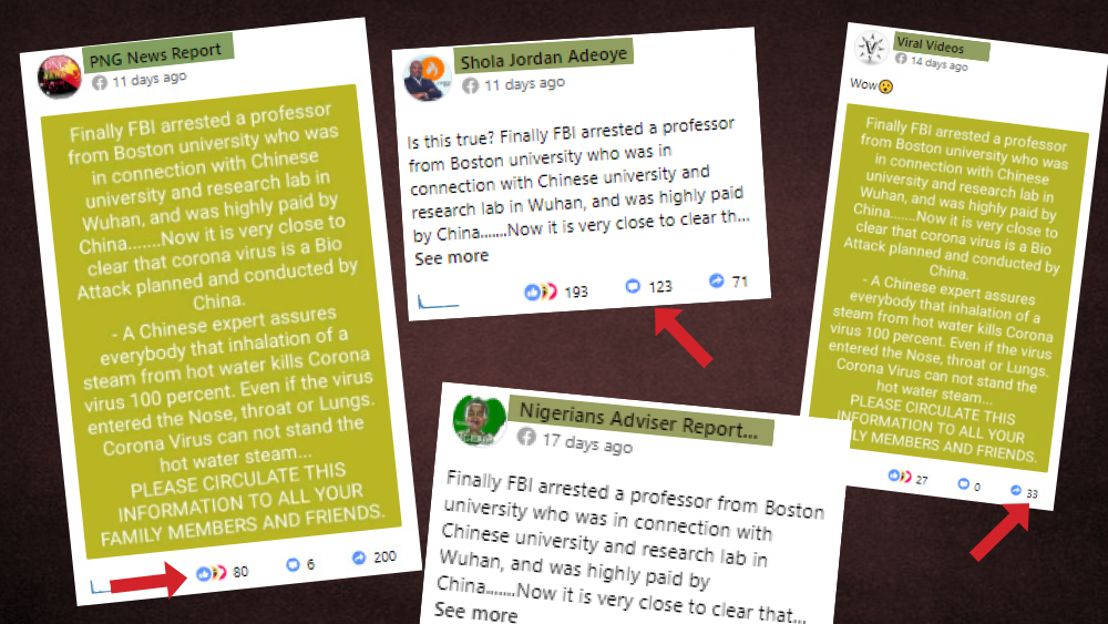 একটি বার্তা, যেখানে বলা হচ্ছে—‘‘মার্কিন গোয়েন্দা সংস্থা এফবিআই বস্টন বিশ্ববিদ্যালয়ের এক অধ্যাপককে গ্রেফতার করেছে। চিনের একটি বিশ্ববিদ্যালয় এবং উহানের একটি গবেষণাগারের সঙ্গে তাঁর যোগাযোগ রয়েছে। চিন তাঁকে মোটা টাকা দিত...এর থেকে প্রায় বোঝাই যাচ্ছে যে, করোনাভাইরাস চিনের পরিকল্পিত এবং পরিচালিত বায়ো-অ্যাটাক।’’