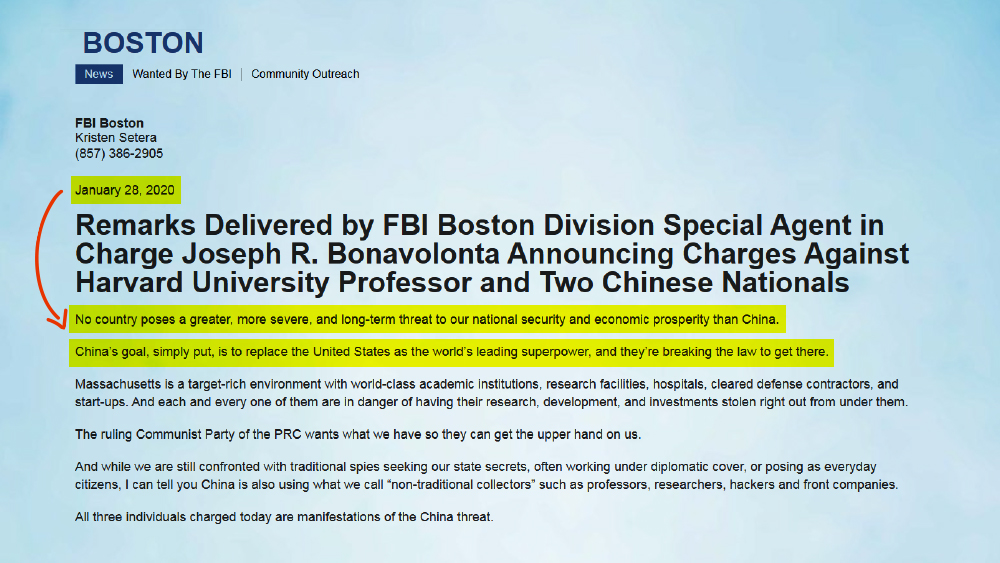 ২৮ জানুয়ারি এফবিআই একটি প্রেস বিবৃতি প্রকাশ করে। তাতে মোট তিনটি গ্রেফতারির কথা বলা হয়। প্রথম জন হার্ভার্ড বিশ্ববিদ্যালয়ের কেমিস্ট্রি ও কেমিক্যাল বায়োলজি বিভাগের প্রধান, চার্লস লিবার। তিনি মার্কিন নাগরিক এবং ওই দিন সকালেই তাঁকে গ্রেফতার করা হয়। তিনি হার্ভার্ডে কর্মরত অবস্থায় চিনা সরকার এবং উহান বিশ্ববিদ্যালয়ের জন্য গবেষণার কাজ করছিলেন।