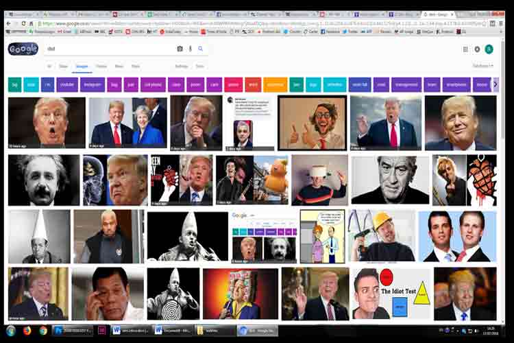 ‘মাই আই কিউ ইজ ওয়ান অফ দ্য হায়েস্ট, অ্যান্ড ইউ অল নো ইট’, একবার নিজের একটি টুইটে এমনটাই লিখেছিলেন মার্কিন প্রেসিডেন্ট ডোনাল্ড ট্রাম্প। কিন্তু গুগলের কেউ বোধ হয় এটা জানেন না! তা না হলে গুগল ইমেজে গিয়ে ‘ইডিয়ট’ লিখে সার্চ দিলে প্রথম ১৫ ফলাফলের মধ্যে ছ’টিতেই ট্রাম্পের ছবি দেখাবে কেন! হ্যাঁ, মূলত ব্রিটেনের গুগল ব্যবহারকারীদের ক্ষেত্রে এমনটাই ঘটেছে।
