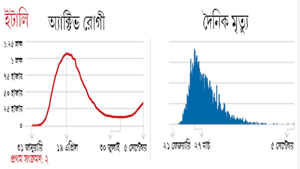 এ মাসের পরিসংখ্যান বলছে, নতুন সংক্রমণ ফের বাড়ছে। কিন্তু ইটালি এ বার প্রস্তুত। দেশে বেশ কিছু নতুন হাসপাতাল হয়েছে, অনেক হাসপাতালকে কোভিড হাসপাতালে পরিবর্তিত করা হয়েছে ও জারি রয়েছে টেস্টিং। নতুন সংক্রমণ ঠেকাতে কড়া নিয়ম জারি থাকছে। মাস্ক না-পরলে বিরাট অঙ্কের জরিমানা (এক হাজার ইউরো পর্যন্ত) ধার্য করা হয়েছে।