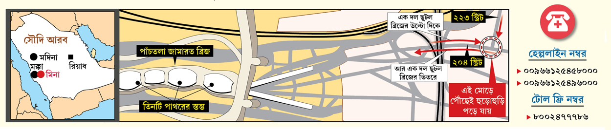 মক্কা থেকে ৫ কিলোমিটার দূরে মিনার পাহাড়ে ঘেরা উপত্যকা। পবিত্র ইদ আল-আধা-র প্রথম দিন ছিল আজ। ঘড়িতে তখন সকাল ১০টা। শহরের ২০৪ ও ২২৩ স্ট্রিট ধরে জমরাত ব্রিজের দিকে যাচ্ছিলেন কাতারে কাতারে মানুষ। হঠাৎই ২২৩ ও ২০৪ স্ট্রিটের মোড়ে হুড়োহুড়ি পড়ে যায়। এক দল লোক জমরাতের দিকে যাচ্ছিলেন। ভিড়ের মধ্যেই অন্য একটি দল উল্টো দিক থেকে আসতে থাকে। শুরু হয় ধাক্কাধাক্কি। কী হচ্ছে বুঝতে না পেরে এক দল ছোটে ব্রিজের উদ্দেশে। অন্য দল ছোটে উল্টো দিকে। আর কয়েক মুহূর্তের মধ্যে পদপিষ্ট হয়ে যান শ’য়ে শ’য়ে মানুষ। প্রত্যক্ষদর্শীদের বয়ানে, প্রাণে বাঁচতে এক-এক জন অন্য জনের ঘাড়ে-কাঁধে উঠে পড়েন। তাতে বিপদ বাড়ে আরও।