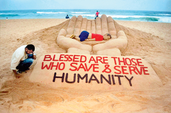 বালি শিল্পে স্মরণ আয়লানকে। সোমবার পুরীতে পিটিআইয়ের তোলা ছবি।