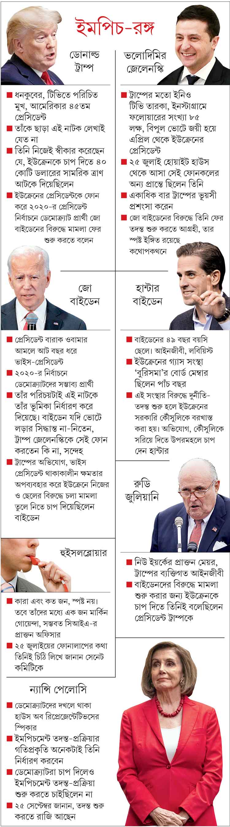 মার্কিন প্রেসিডেন্টকে ইমপিচ করা হবে কিনা, তা নিয়ে প্রকাশ্যে শুনানির প্রথম সপ্তাহটা চাপের উপরেই থাকতে হল প্রেসিডেন্ট ডোনাল্ড ট্রাম্পকে। হাউস অব রিপ্রেজ়েন্টেটিভসের তদন্ত কমিটি বিদেশ দফতরের বেশ কয়েক জন আধিকারিকের সাক্ষ্য শুনেছে। যাঁরা বলেছেন, ট্রাম্প-ঘনিষ্ঠ রুডি জুলিয়ানির নেতৃত্বাধীন নীতি নির্ধারণকারী ‘গোপন’ একটি গোষ্ঠীর ছত্রছায়ায় কাজ করতে গিয়ে কী পরিমাণ অসুবিধের মুখে পড়তে হয়েছে তাঁদের। তাঁদের দাবি, ওই গোষ্ঠী গুরুত্বপূর্ণ বিদেশি অনুদানের বিনিময়ে নির্বাচনী-প্রচারে সাহায্যের আশ্বাস আদায় করেছিল।