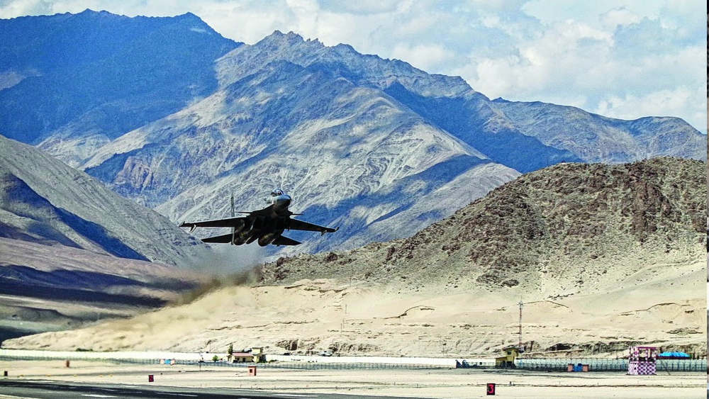 গালওয়ান সংঘর্ষের পর লেহ বিমানঘাঁটি থেকে উড়ছে ভারতীয় যুদ্ধবিমান। ছবি: পিটিআই